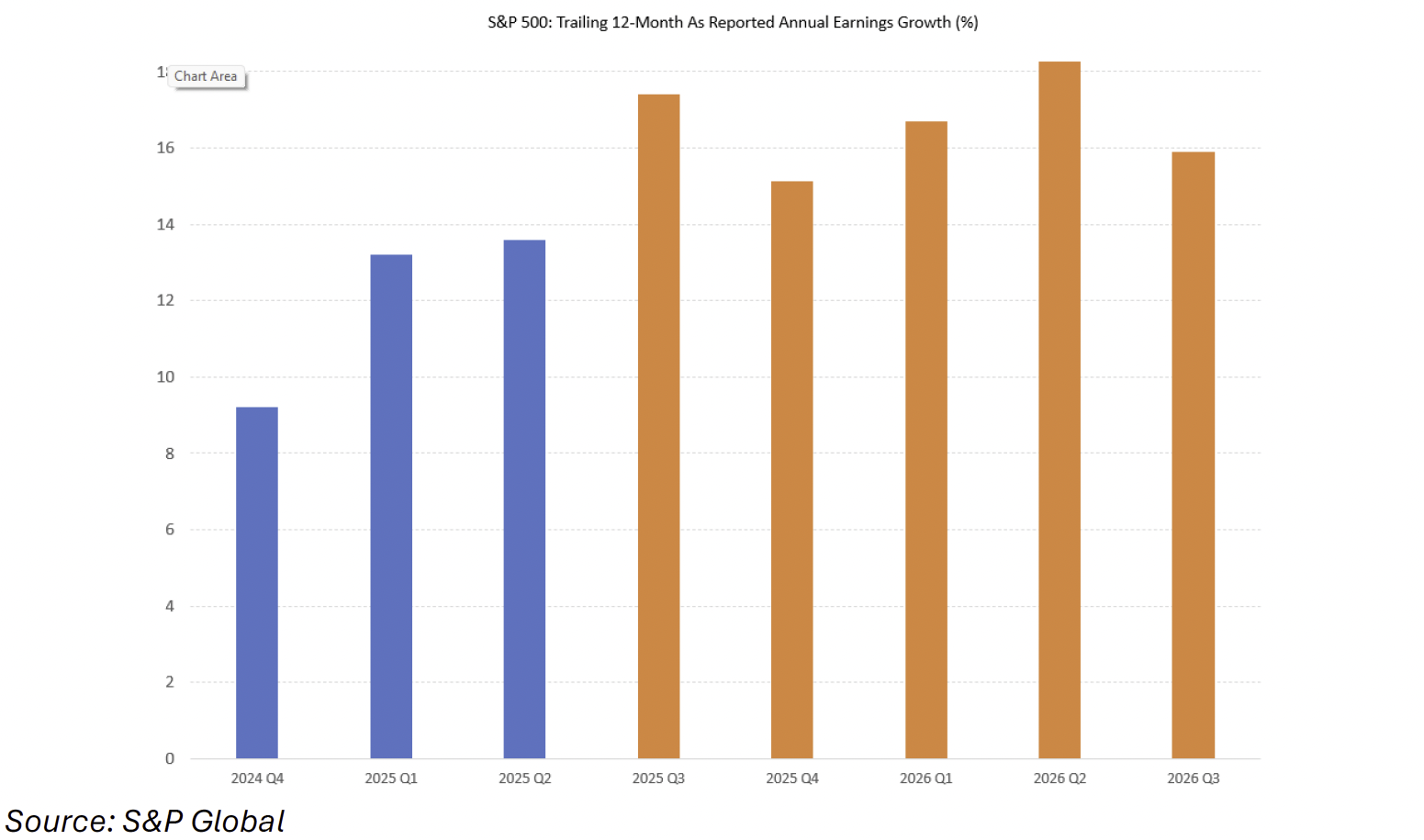 So why do we as investors care so much about the economic growth outlook? Because Real GDP growth is the primary determinant of corporate profit growth, which is the primary determinant of stock market performance. And when it comes to projections for earnings growth in the upcoming quarters according to S&P Global, the outlook remains strong with projections in the mid- to high teens. These are the type of fundamentals that, if realized, typically support high stock prices over time.