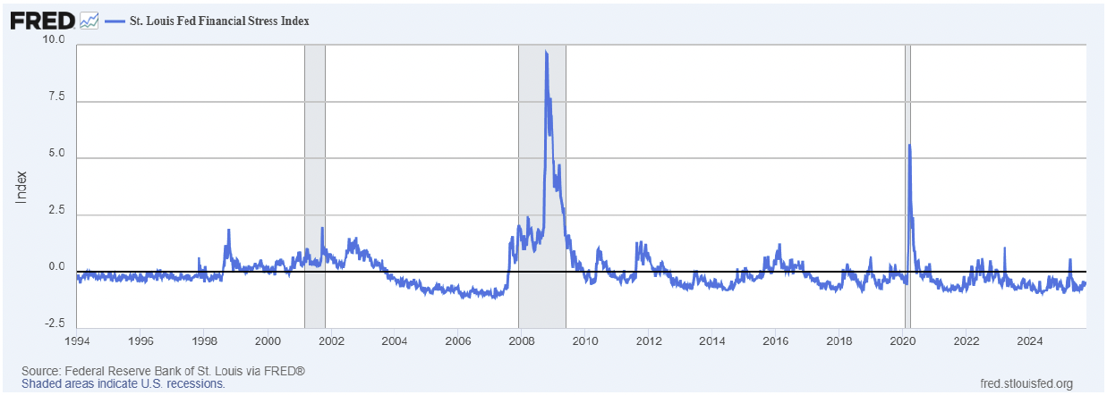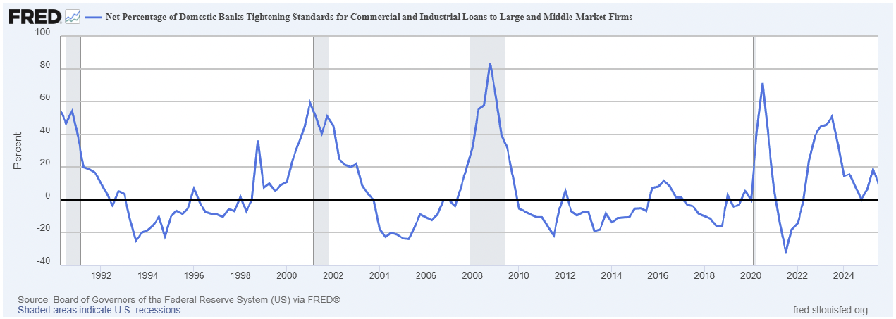 Let’s start with a good old fashioned indicator of banking system stress.  Are banks showing the increasing propensity to not want to lend money to their business customers?  For this, let’s turn to the Senior Loan Officer Opinion Survey (SLOOS) on Bank Lending Practices and focus on the Net Percentage of Domestic Banks Tightening Standards for Commercial and Industrial Loans to Large and Middle-Market Firms.  Put simply, are banks infested with ‘cockroaches’ and thus increasingly shying away from lending out money to businesses?  The answer here is decidedly “no”.  Only 9.5% of domestic banks were tightening lending standards in 2025 Q3 according to the latest survey, which stands in sharp contrast to the north of 50% of banks that were pulling back on lending money during past episodes of stress like the 2022 inflation outbreak, the 2020 pandemic, the 2008 financial crisis, the 2000 bursting of the tech bubble or the early 1990s commercial banking squeeze.  If anything, banks are not deeply moved by what is not unusual today.