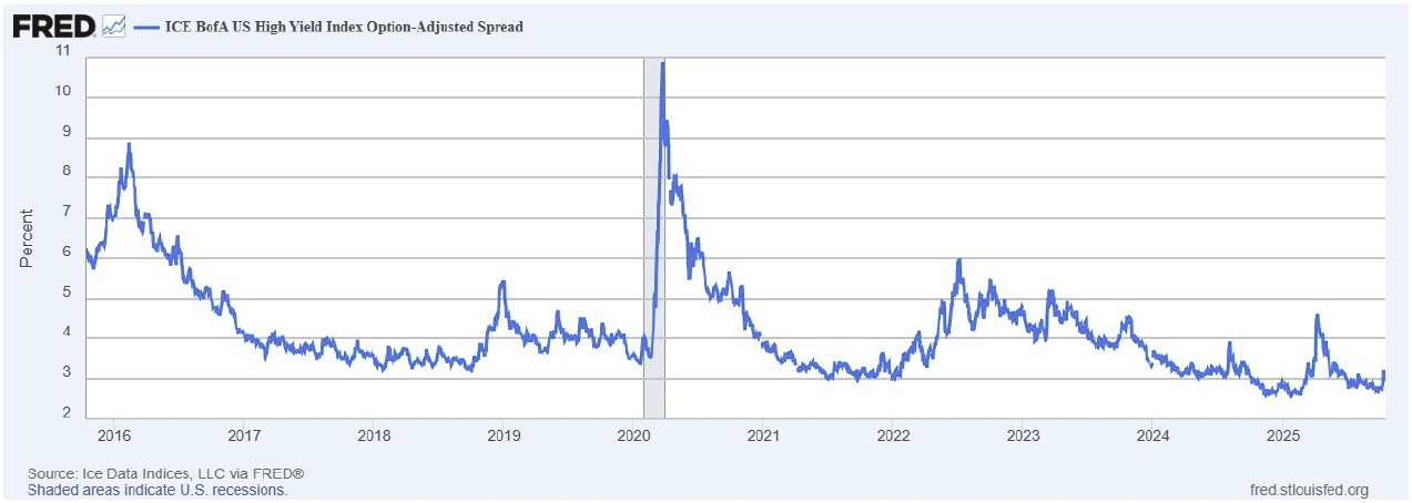 We’ll keep going to another indicator that gets baked fresh daily out of the capital markets oven, which is high yield spreads.  What’s happening here?  This is the additional yield that investors require on any given trading day for taking on the additional risk of owning high yield bonds versus U.S. Treasuries.  The higher the reading, the more stressed the financial system.  Where do we stand today?  In contrast to periods like the mid-2010s when a slew of exploration and production companies were going belly up, 2020 in the depth of COVID, 2022 when a scorching case of inflation infected capital markets, or even early 2025 when the tariff tantrum had markets locking up in the spring, we have seen a modest blip in recent trading days (squint to the bottom right and you might be able to see it!), but we remain at historically low levels in terms of the additional premium required by investors for owning riskier assets.