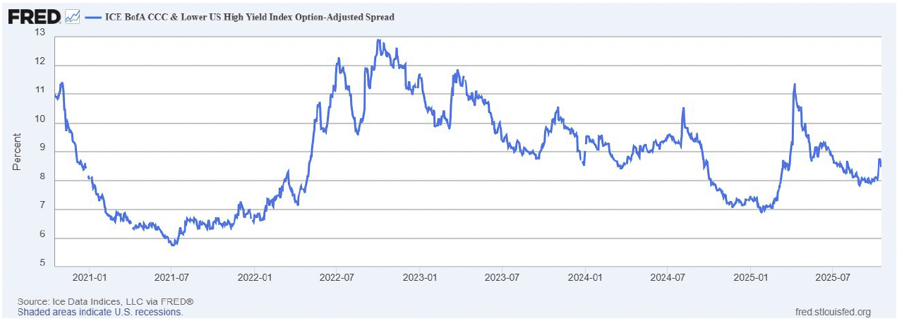 Still all good, but let’s go one more for good measure and focus on the worst of the worst, which are your companies in the CCC or lower credit quality space.  This is often among the first areas of the market where signs of stress will emerge, as lenders will almost always pull back on their lowest quality borrowers first before the rest of the pack.  How do we stack up here?  OK, we’ve popped higher on these spreads by around 60 bps in recent days, this move is minimal to none in comparison to periods like 2020, 2022, early 2023 when a group of banks like Silicon Valley Bank were suddenly going belly up, or early 2025.