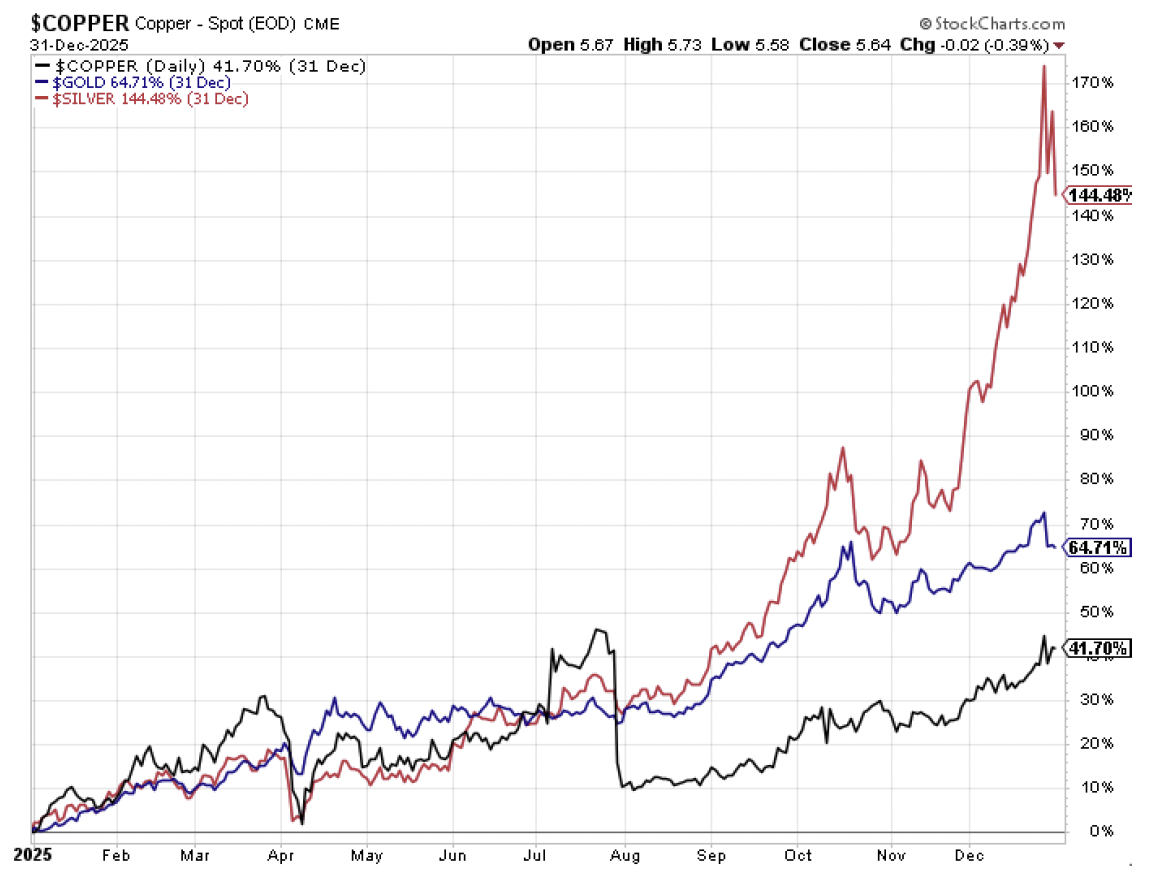 Over the course of 2025, prices of copper rose from approximately $8000 per ton to the mid $12,000s. The metal got a significant boost over the summer after President Donald Trump announced a 50% tariff on copper and copper-intensive goods, a move aimed at reducing reliance on foreign suppliers and strengthening the domestic supply chain. Later that month, the administration clarified that the final tariff would apply only to semi-finished copper products and copper-intensive derivatives, not raw or refined copper. This caused prices to drop briefly, but supply disruptions, most notably major mudflows at Freeport McMoRan’s Grasberg mine, one of the largest supply sites in the world for copper, sent prices back on a steady upward trend. The metal finished the year up more than 40%, its biggest annual jump since 2009. Priced per pound, copper is currently trading near $5.92 with prices topping $6.50 just last week. Overall, the outstanding performance represents a structural reassessment of one of the most frequently utilized metals globally.
