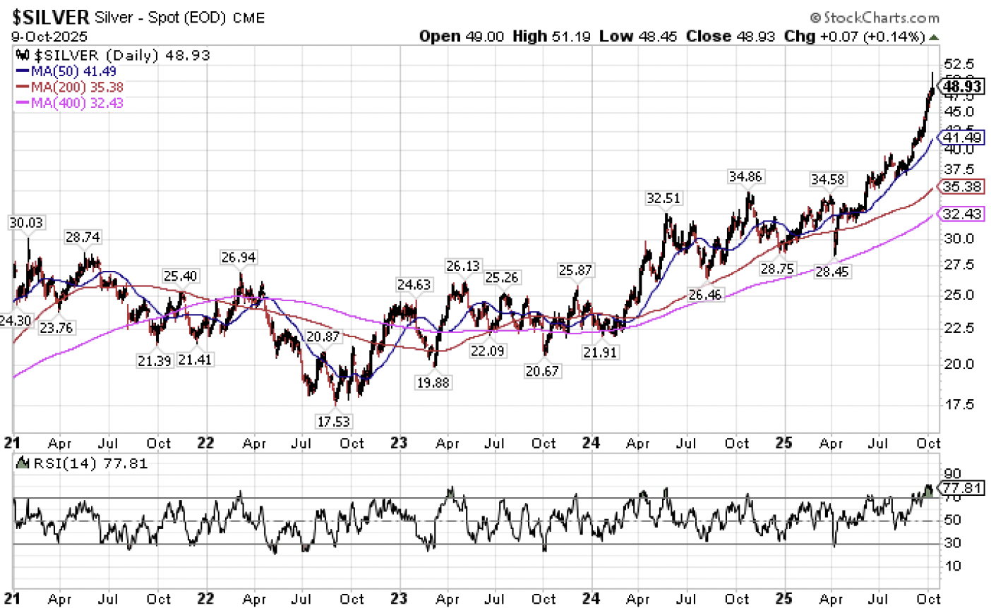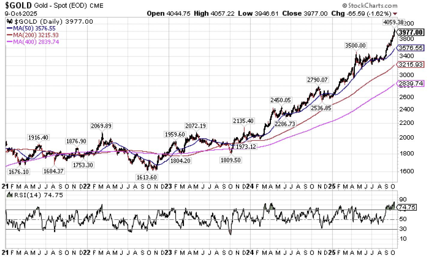 We’ll begin with gold.  Uncorrelated with stocks.  Uncorrelated with bonds.  The yellow metal enters the asset allocation modeling conversation as a diversifier to manage correlation risk within a portfolio.  The only problem was that you simply couldn’t give away the “barbarous relic” up until recently.  No cash flow, no yield, no absolute metrics to measure valuation.  And worst of all it has been an asset that reached a price peak of $1920 back in 2011 and was trading at or below this same price less than two years ago at the end of 2023.  But what has happened since has been extraordinary.  From the start of 2024 through about six weeks ago, the price of gold spiked from around $2000 to $3400.  Amazing and much better than the headline dominating S&P 500 over the same time period.  And in the past six weeks since the start of September, gold has gone parabolic in rising from $3400 to over $4000.  In a word – wow!  And just like that, an asset that would get little more than looks of derision for more than a decade is suddenly getting talked about by everyone.